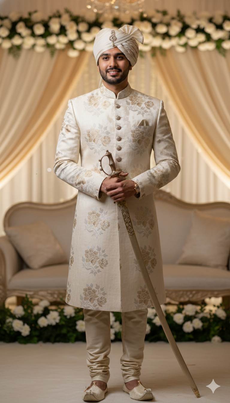 This exclusive beige chanderi fabric features a beautiful self-embossed jacquard pattern with golden flowers, perfect for traditional sherwanis and wedding attire. Its dyeable nature allows for customization, making it a versatile and high-quality choice for ethnic garments.