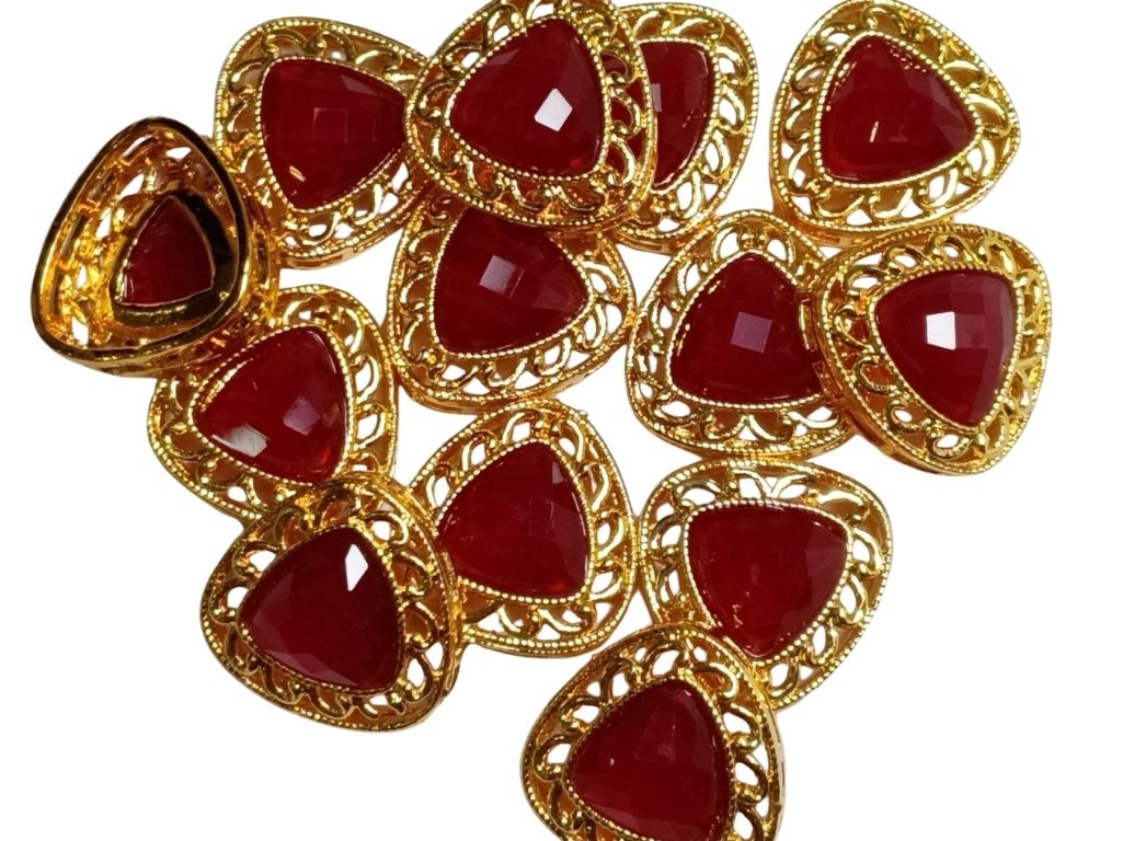 Triangular metal kundan stones bring a sharp, geometric twist to traditional embellishment. Each piece features a reflective kundan setting framed in a sturdy metal base, giving outfits and accessories a refined, handcrafted sparkle. They work well for blouses, lehengas, bridal wear, jewellery making, and DIY decor where you want a mix of heritage and modern edge.