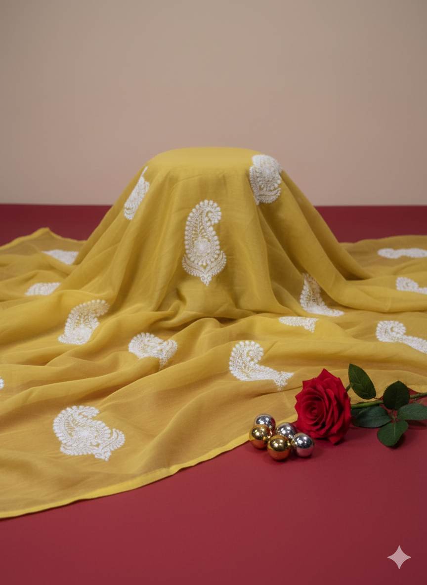 Upgrade your wardrobe with this elegant Leman Yellow Chanderi fabric. The white thread Paisley chickenkari butta design adds a touch of sophistication to your dresses, making them perfect for any occasion. Elevate your style game with this versatile fabric, perfect for duppata and salwar kameej.