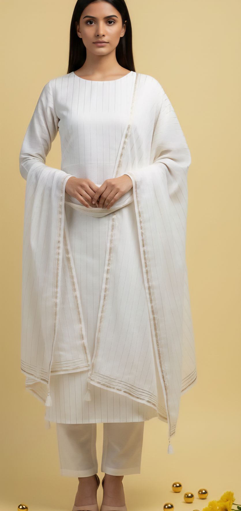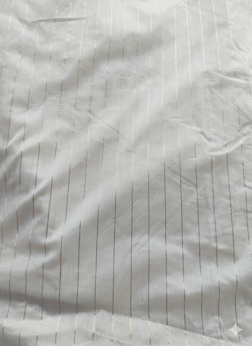 This exquisite chanderi fabric boasts a classic white color adorned with delicate golden stripes. Crafted from soft and lightweight materials, it offers a luxurious touch and timeless elegance to any garment. Elevate your wardrobe with this versatile and sophisticated fabric.Golden striped white Chanderi Fabric