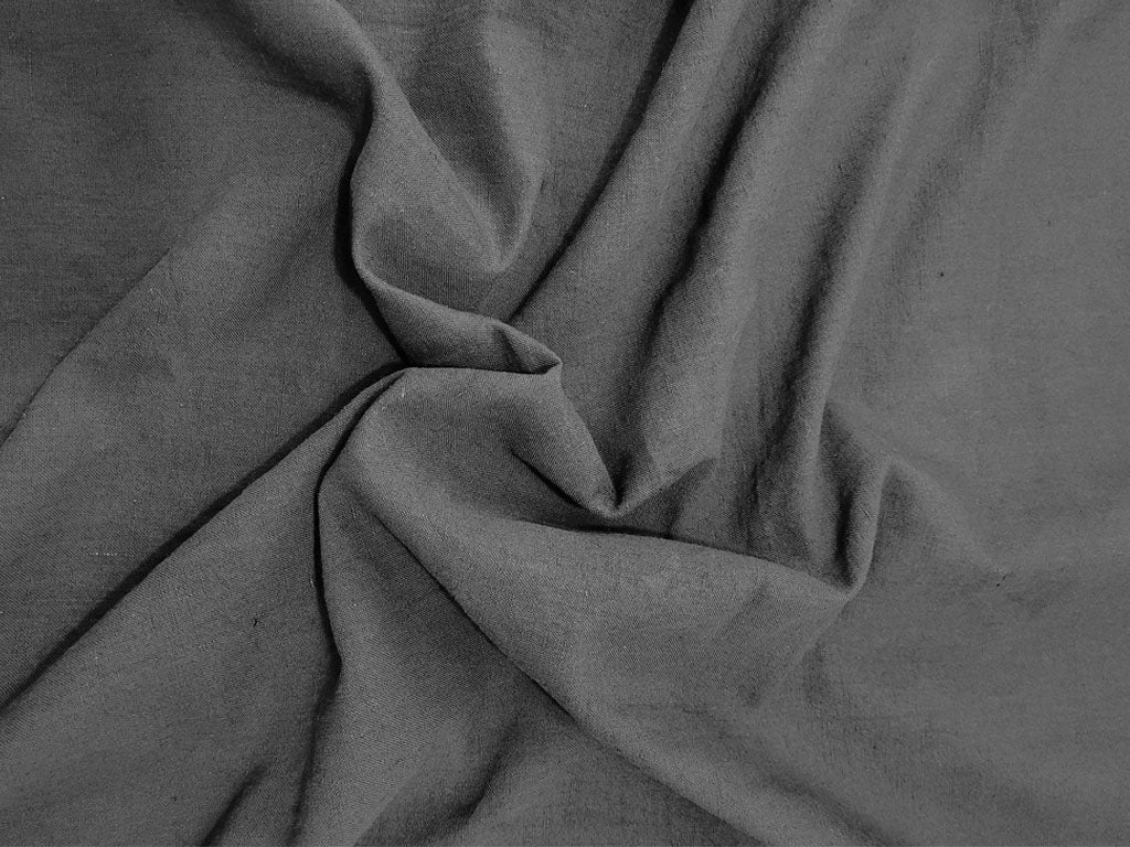 This refined khadi-linen blend fabric features a solid charcoal grey tone, created using 56s double count khadi yarn in the warp and 50s single count linen yarn in the weft. The yarn-dyed technique enhances the richness and depth of the color, giving the fabric a sophisticated and even finish.