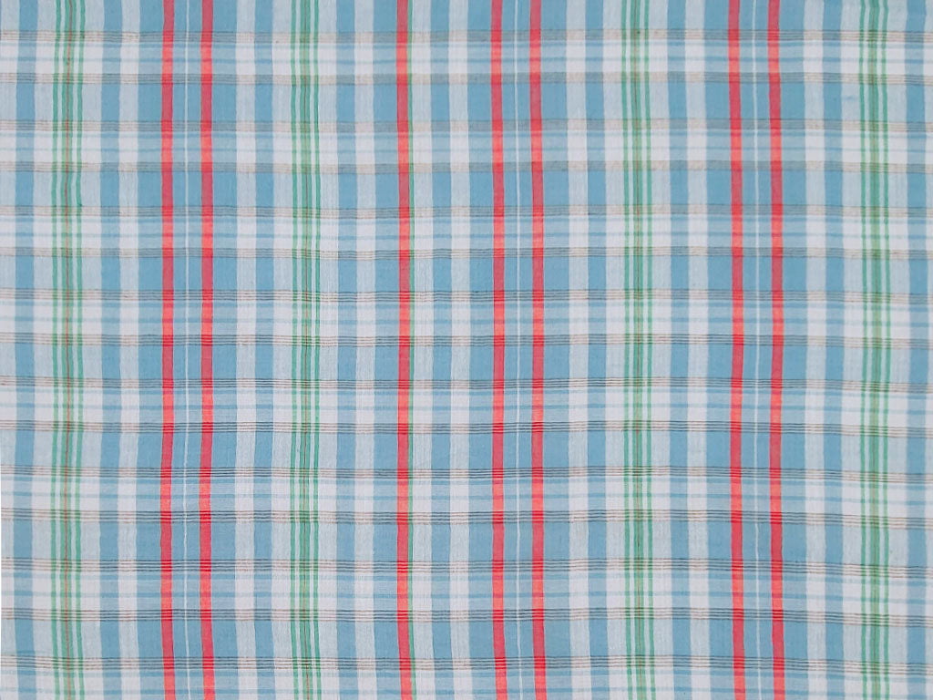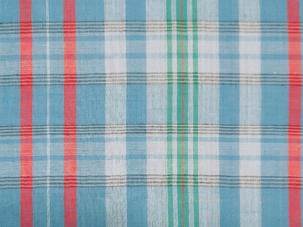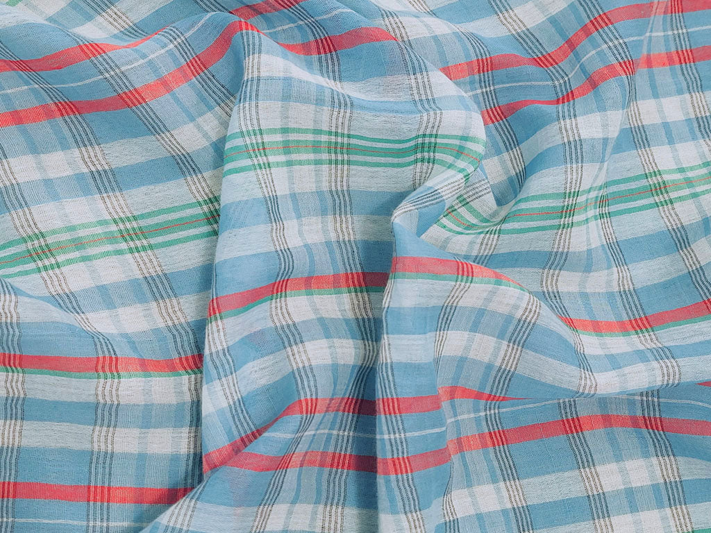 This beautifully handwoven and yarn dyed 100s count khadi fabric showcases a refreshing checked pattern in soothing blue tones, accented with subtle red, green, and fine black stripes. Crafted from fine cotton yarn, the fabric is lightweight, breathable, and incredibly soft, making it ideal for all-day comfort.