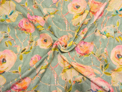 Pastel Green 100 % Pure Cotton Chikan Embroidered Fabric