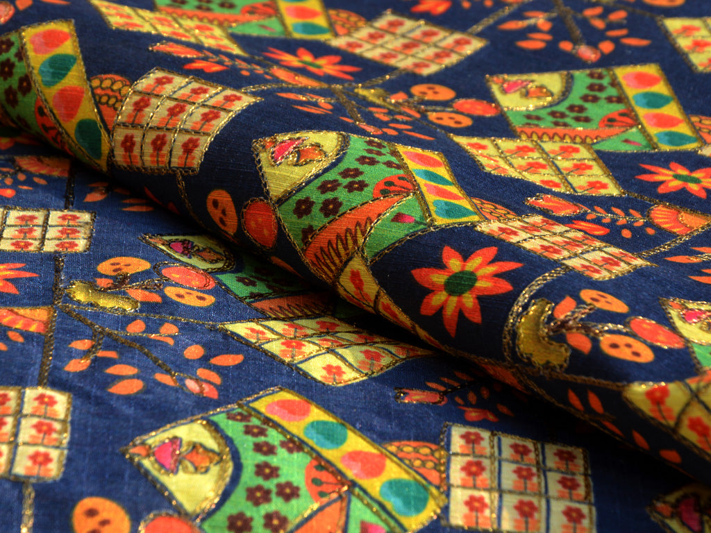 Precut of 1.8 Meters of Dark Blue Multicolor Traditional Digital Print Zari Embroidered Mulberry Silk Fabric