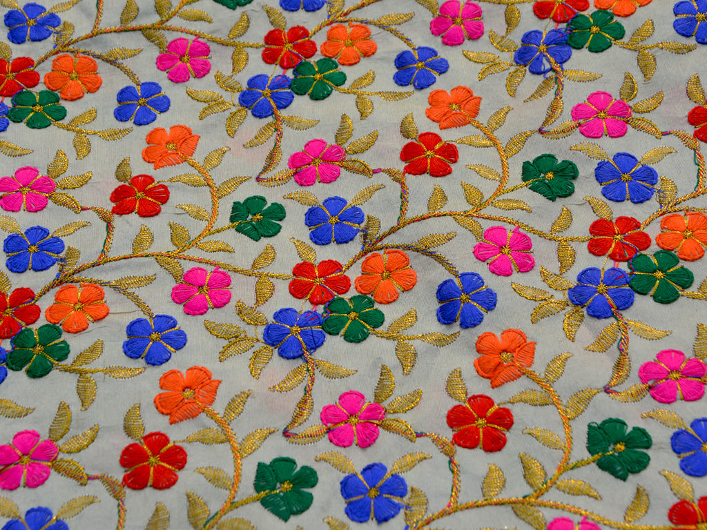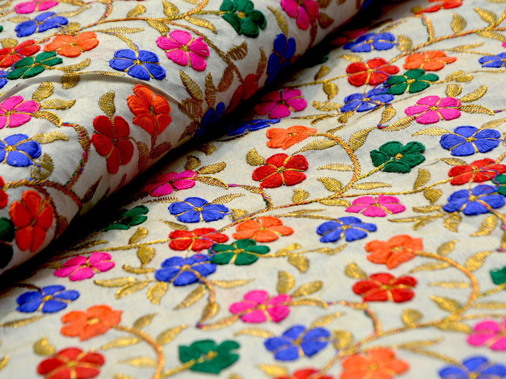 Precut of 1.9 Meters of Cream Multicolor Floral Thread & Zari Embroidered Mulberry Silk Fabric
