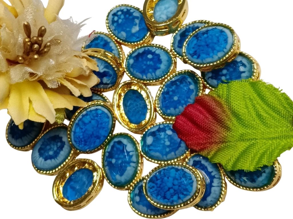 Oval-shaped resin stones with metal catchers offer a smooth, glossy finish paired with a secure metallic frame. They’re lightweight yet premium-looking, making them ideal for blouses, gowns, accessories, and DIY jewellery projects. The metal catcher adds durability and easy application while the resin stone brings a clean, polished shine to any design.