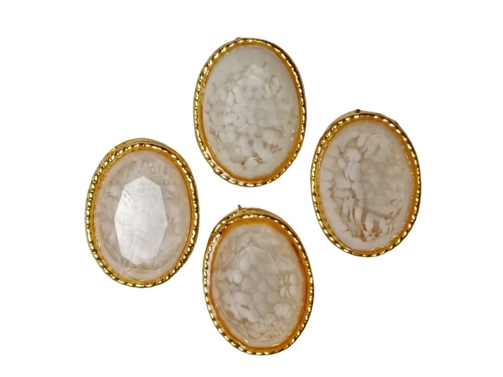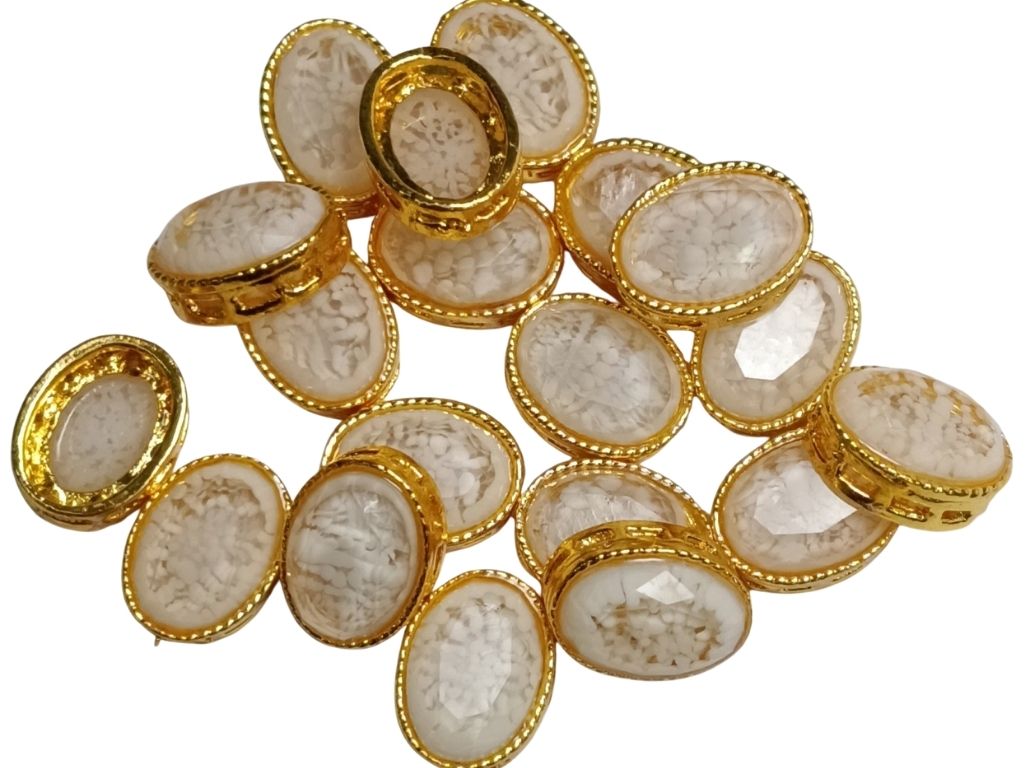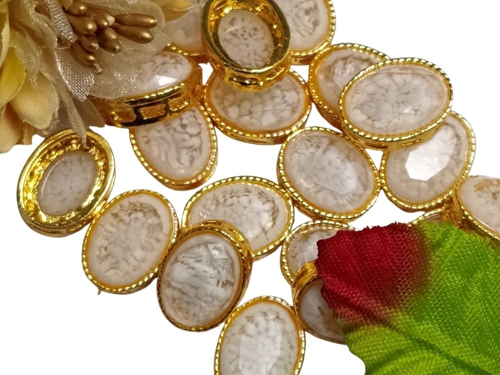 Oval-shaped resin stones with metal catchers offer a smooth, glossy finish paired with a secure metallic frame. They’re lightweight yet premium-looking, making them ideal for blouses, gowns, accessories, and DIY jewellery projects. The metal catcher adds durability and easy application while the resin stone brings a clean, polished shine to any design.