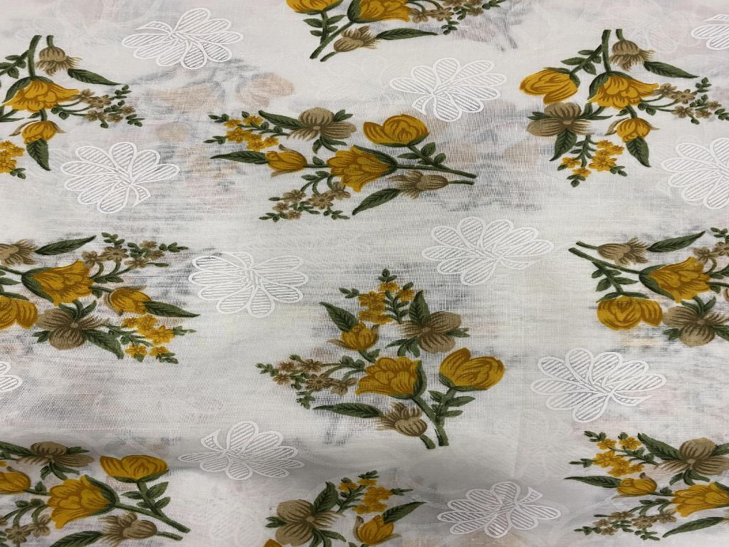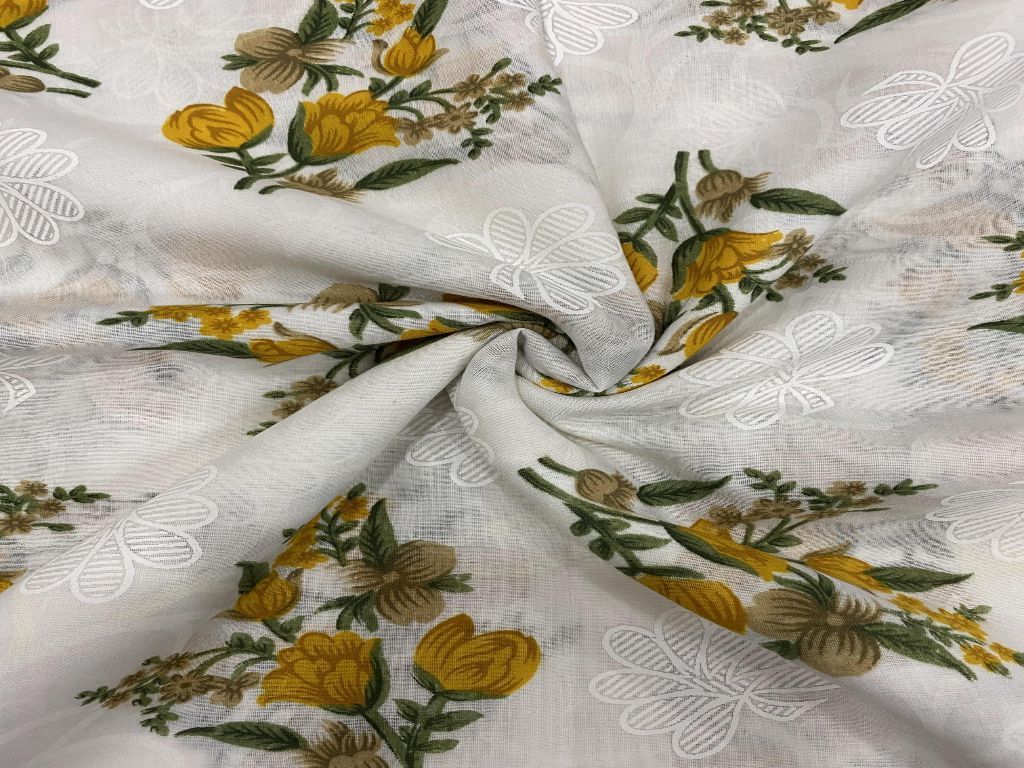 White Yellow Brown Flowers Printed Pure Cotton Fabric